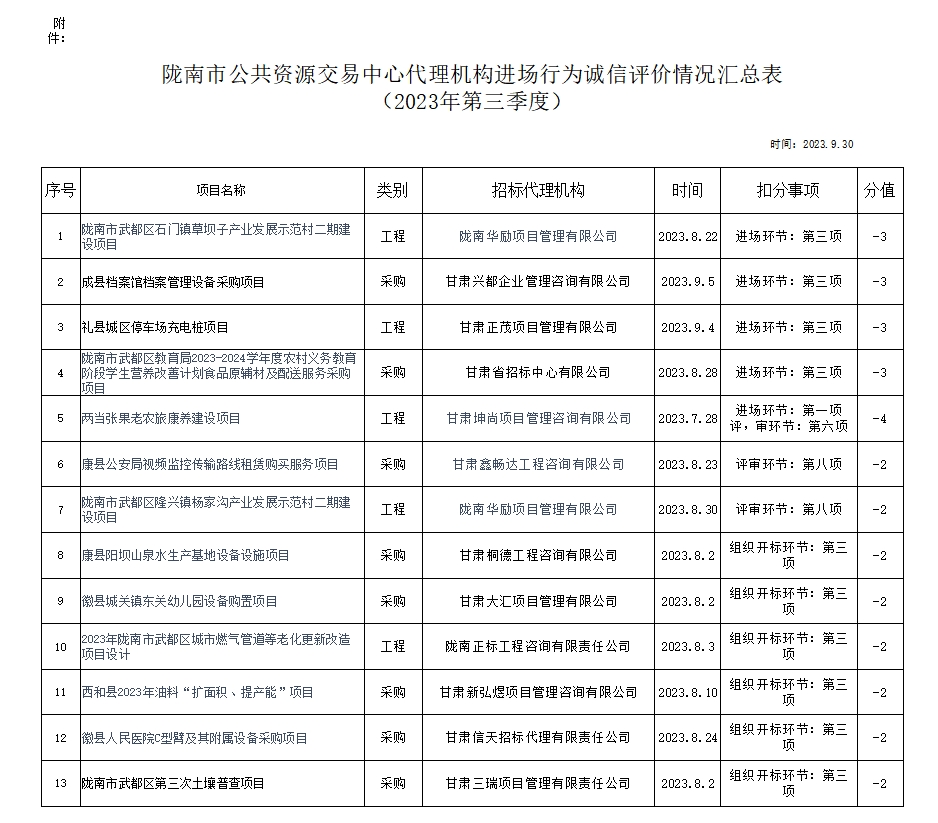 根據(jù)《甘肅省公共資源交易代理機構(gòu)管理辦法》(甘政辦發(fā)〔2019〕107號)和《隴南市公共資源交易中心代理機構(gòu)進(jìn)場行為誠信評價實施制度(試行)》規(guī)定,現(xiàn)對2023年第三季度,共 12 家代理機構(gòu) 13 條進(jìn)場行為誠信評價記錄予以通報(詳見附表)。請各代理機構(gòu)嚴(yán)格遵守各項規(guī)章制度、誠實守信,規(guī)范操作,為招標(biāo)人和采購人提供專業(yè)、高效、規(guī)范的招標(biāo)代理服務(wù)。