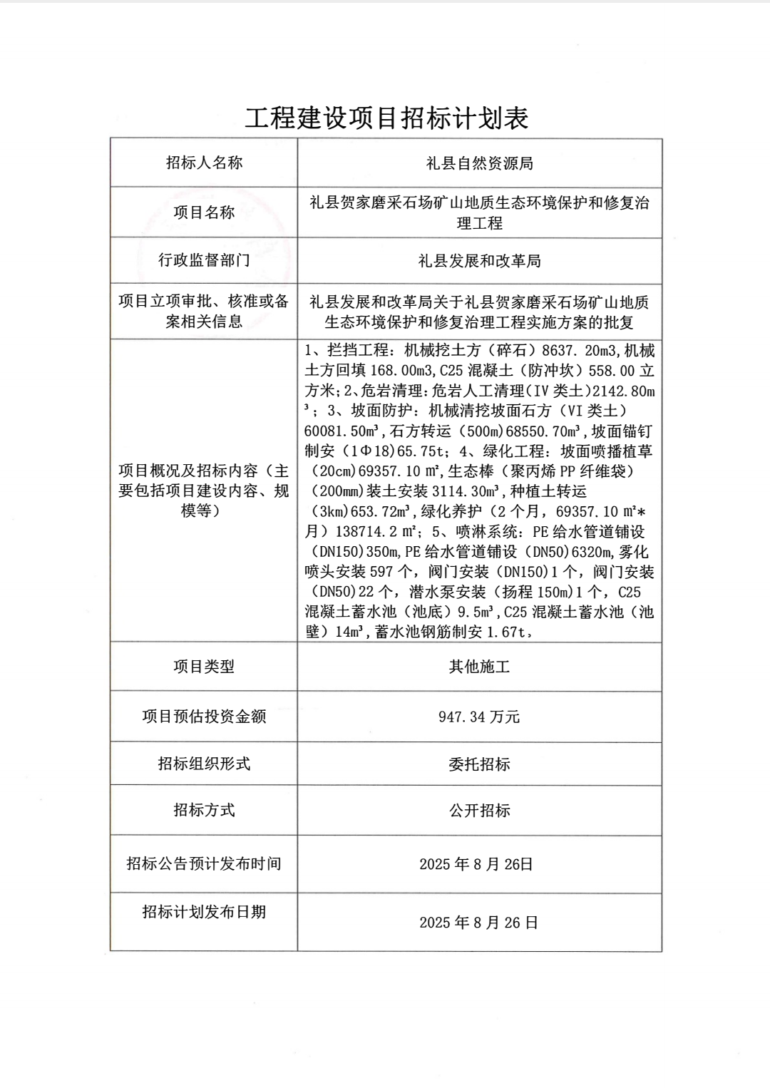 禮縣賀家磨采石場礦山地質(zhì)生態(tài)環(huán)境保護和修復治理工程