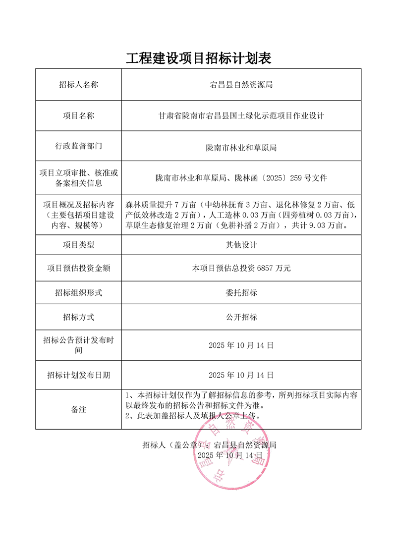 附件:工程建設項目招標計劃表甘肅省隴南市宕昌縣國土綠化示范項目作業(yè)設計.pdf
