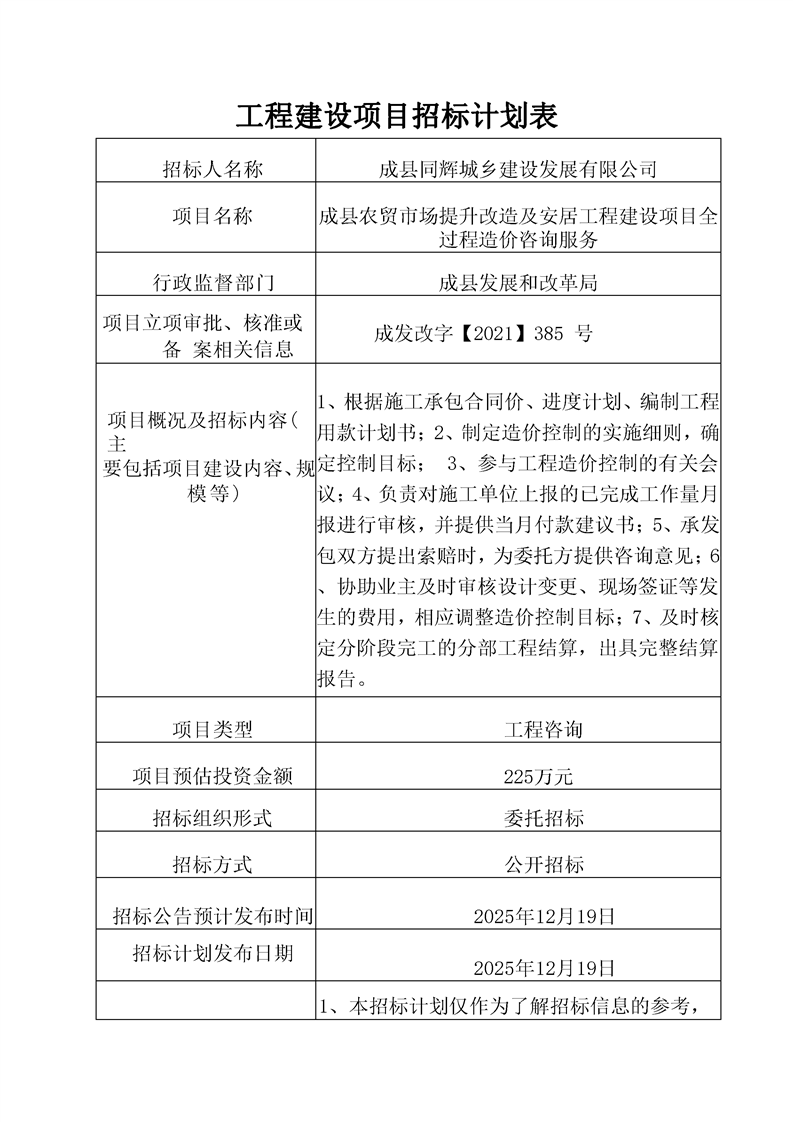 成縣農貿市場提升改造及安居工程建設項目(一期)全過程造價咨詢服務