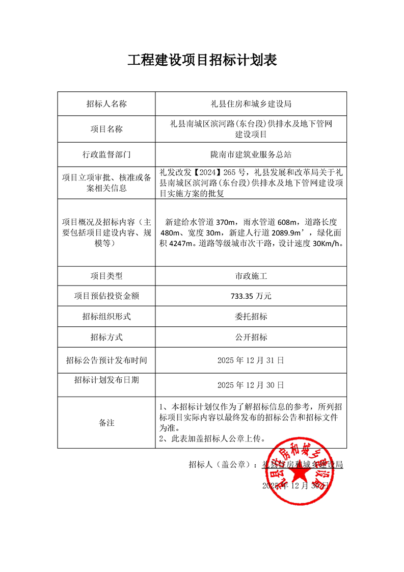 禮縣南城區(qū)濱河路(東臺(tái)段)供排水及地下管網(wǎng)建設(shè)項(xiàng)目