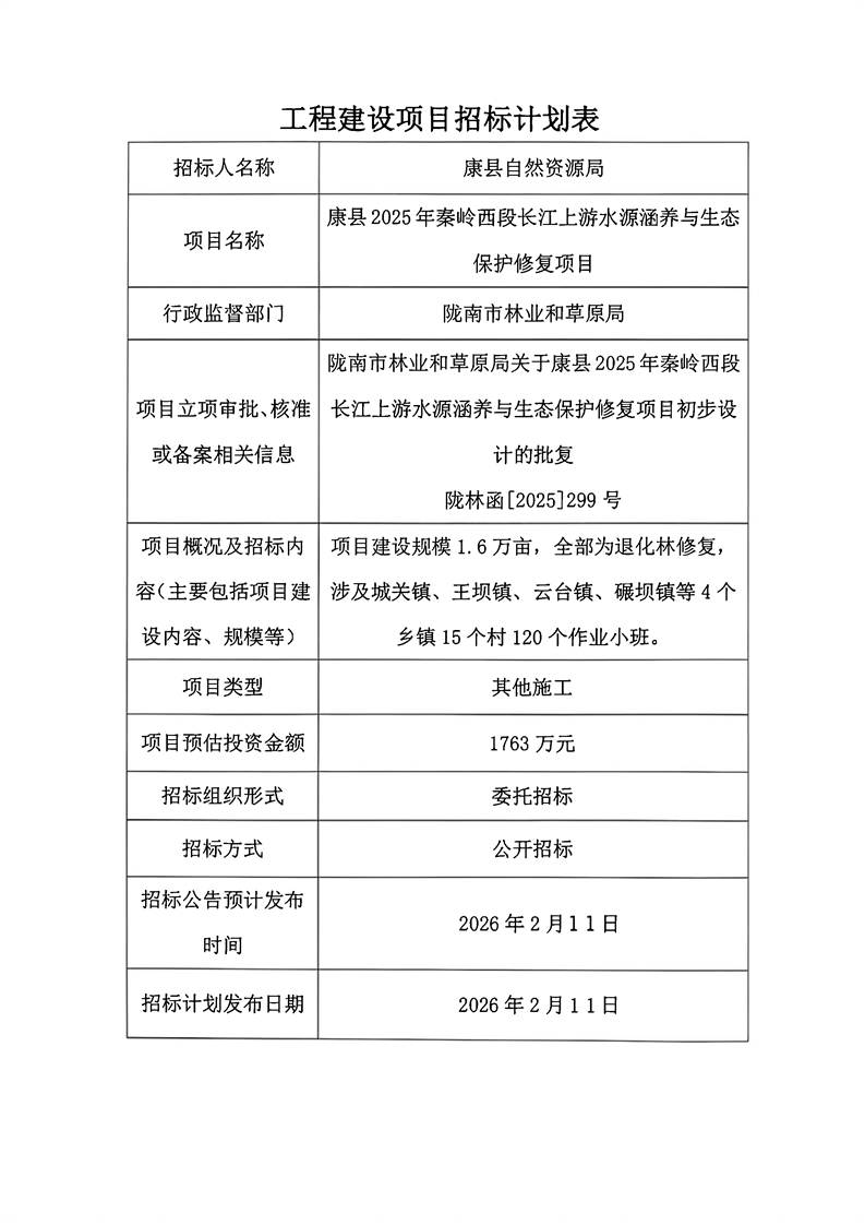 康縣2025年秦嶺西段長江上游水源涵養(yǎng)與生態(tài)保護修復項目