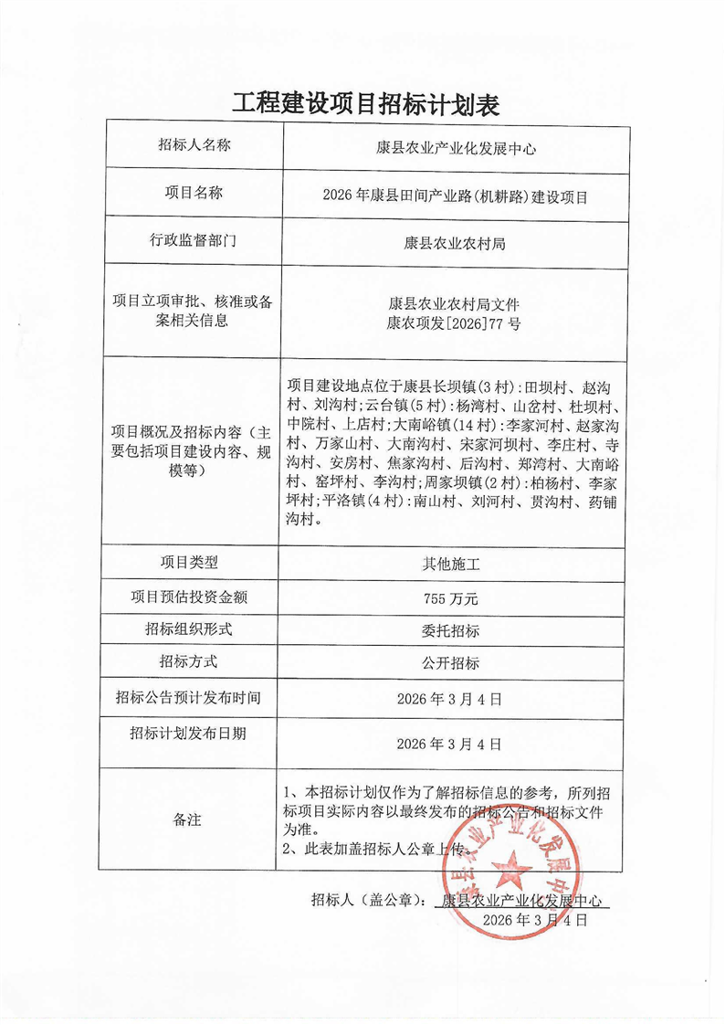 2026年康縣田間產(chǎn)業(yè)路(機耕路)建設(shè)項目