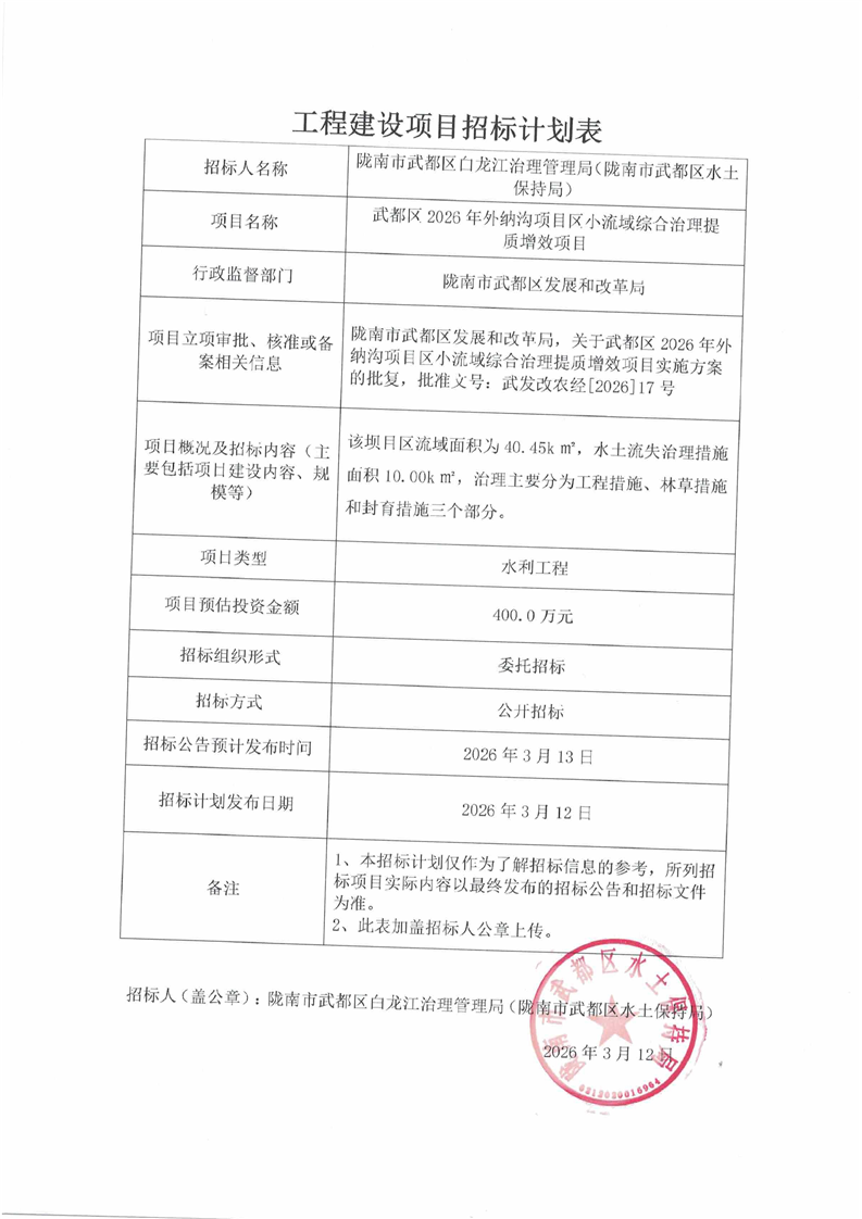 武都區(qū)2026年外納溝項目區(qū)小流域綜合治理提質(zhì)增效項目