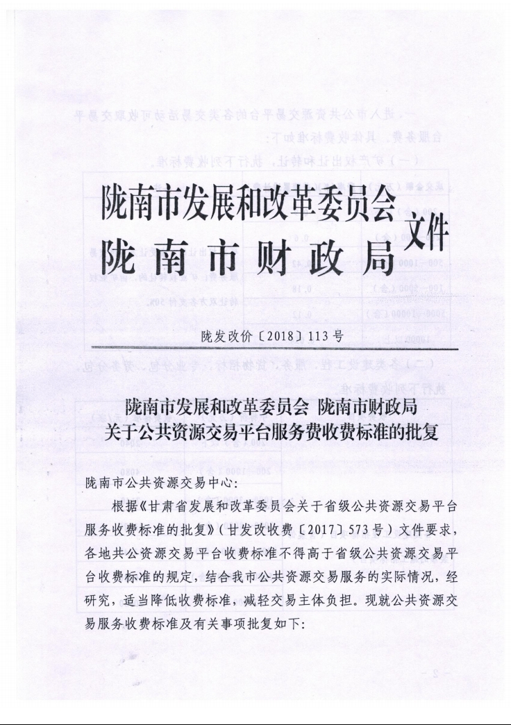 隴南市發(fā)展和改革委員會 隴南市財政局關(guān)于公共資源交易平臺服務費收費標準的批復